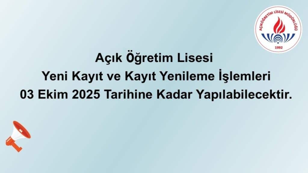 2025/2026 Eğitim Öğretim Yılı Yeni Kayıt ve Kayıt Yenileme işlemleri 03/10/2025 tarihine kadar yapılabilecektir. Konu hakkında geniş bilgi için Açık Öğretim Lisesi Müdürlüğü'nün internet sitesini ziyaret edebilirsiniz.